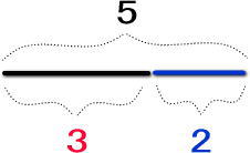 これができれば「ぜんぶで積み木5個だよね。だから、このように書けるよね。これを線分図と言うんだ」といって、つぎの図を描いてあげてください。